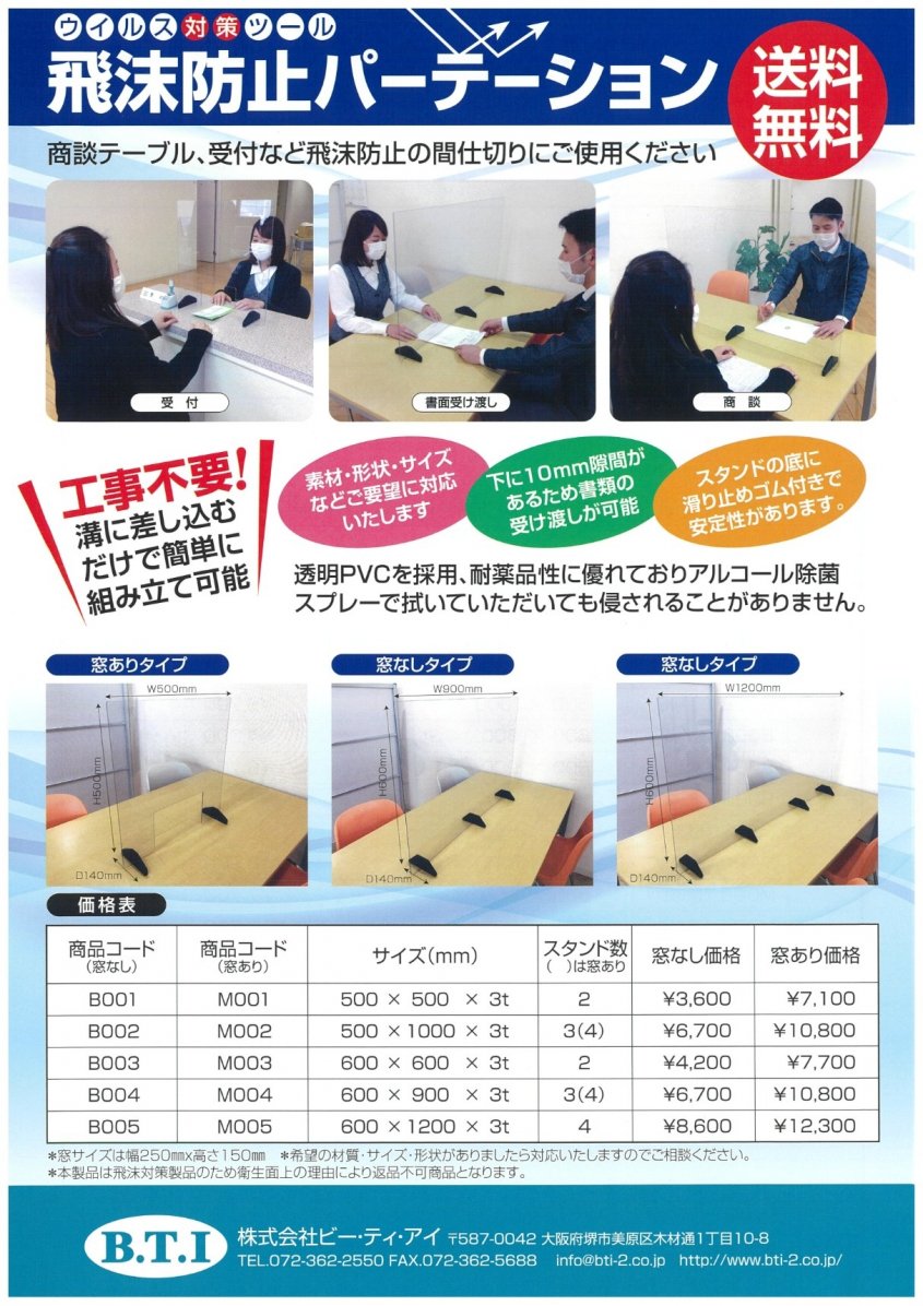 組合員 株式会社ビー・ティ・アイでは、コロナウイルスの影響でも営業活動を止められないビジネスパーソンや事業者のために、飛沫防止パーティションの販売を開始されました。