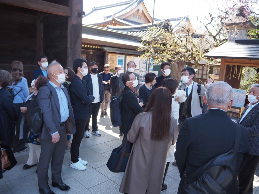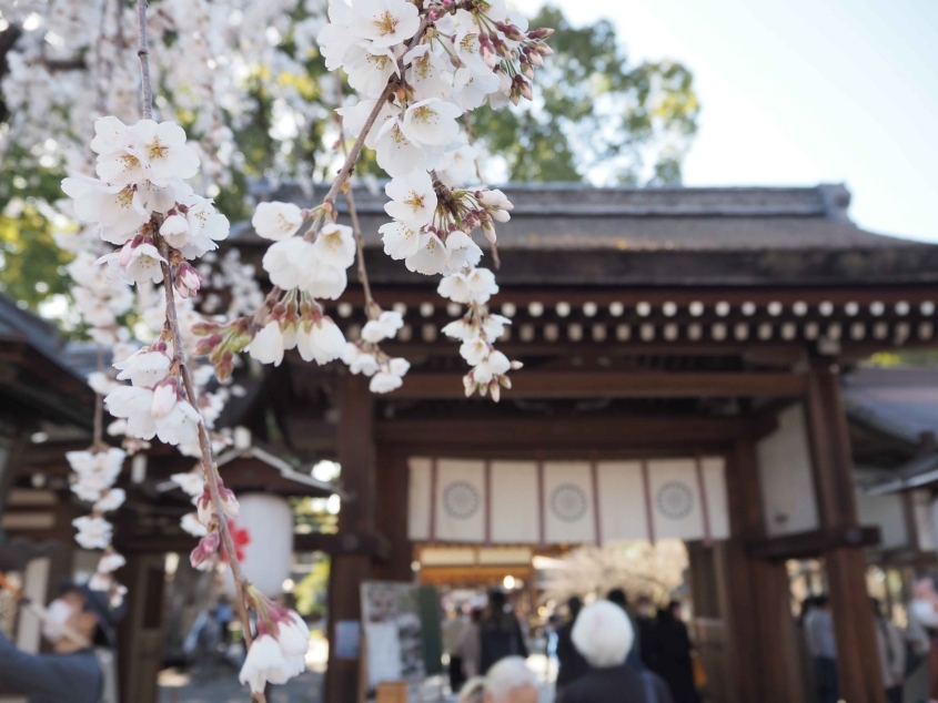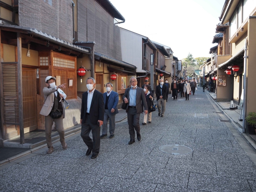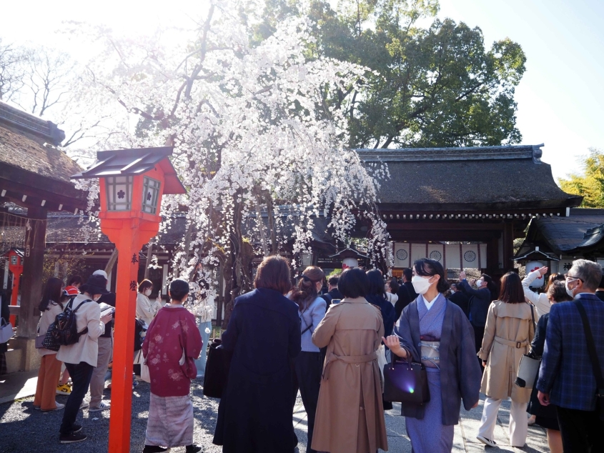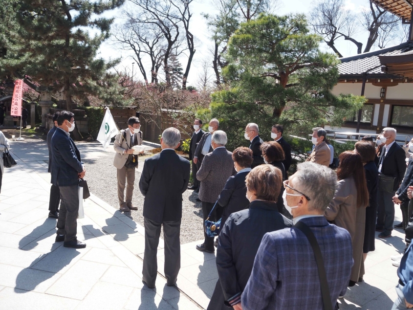 当日は、前日からの雨もあがり晴天に恵まれ、穏やかな春風にふかれながら参加者は北野天満宮、平野神社、上七軒通り、