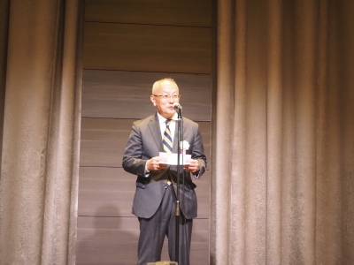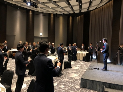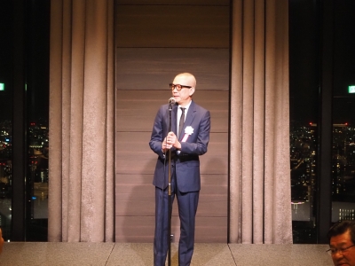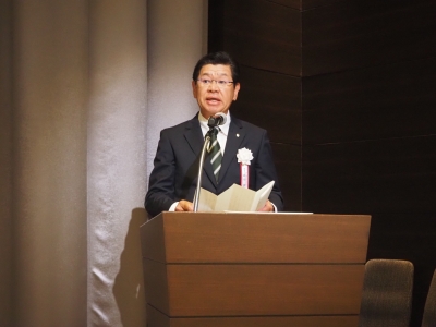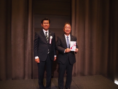 引き続き、総会終了後の懇親会では、大阪府知事表彰を受賞された山本洋介氏(大阪木材工場団地協同組合 副理事長 株式会社ボンビアルコン 代表取締役社長)の披露と、堀川理事長より記念品の贈呈が行われ、栄誉を祝福しました。