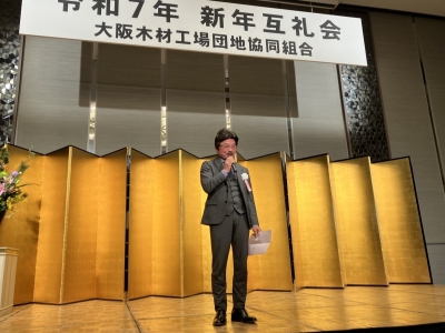 当協同組合の新年互礼会を、令和7年1月16日(木)にスイスホテル南海大阪(大阪市中央区)にて多方面から来賓の方々を招き、組合員企業・友好企業、総勢89名の出席のもと盛大に開催した。 堀川 昇 理事長 本屋 和宏 堺市副市長 立札風景 ㈱商工組合中央金庫 大阪市店 赤間 隆志 氏による乾杯の音頭 開宴挨拶 山本 副理事長 閉宴挨拶 石本 副理事長 大阪木材工場団地協同組合にもどる