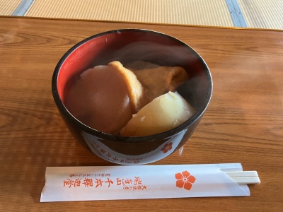 大根の切口に梵字を書いて魔除けを行い、法要後に大根を加持祈祷し、炊いた[大根焚き]をいただきました。