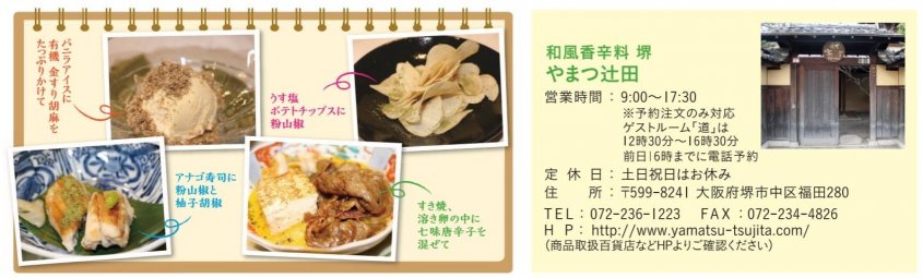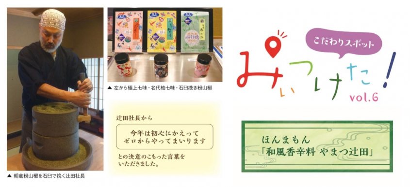 私が、やまつ辻田さんの商品に初めて出会ったのは、某百貨店での夏の催事場。もともと七味唐辛子が大好きな私は、キリッと冴えた香りに思わず足を止めてしまいました。催事場では、辻田社長自ら季節に合わせた調合を実演されます。使用する材料にもそれぞれ旬が違うので季節によって、そしてその配合によって違う風味になるようです。一般的に香辛料は脇役となりがちですが、やまつ辻田さんの和風香辛料は少し加えるだけでお料理の味がグッとひき立ち、格段に美味しくなる優れものです。辻田社長は大阪のみならず遠方の催事にも出向かれ、これ以上ない粉を作るという熱い思いを込めてお客様へ丁寧にご説明されます。ほんものを伝えるには、やはり手間も時間もかかるけれど自ら伝道師となり今まで積み重ねて来られたようです。今では各方面の老舗料理店でも使用され、またテレビや雑誌取材も多数受けておられます。昨年9月には関西テレビよ~いドン!『となりの人間国宝』にも認定されました。